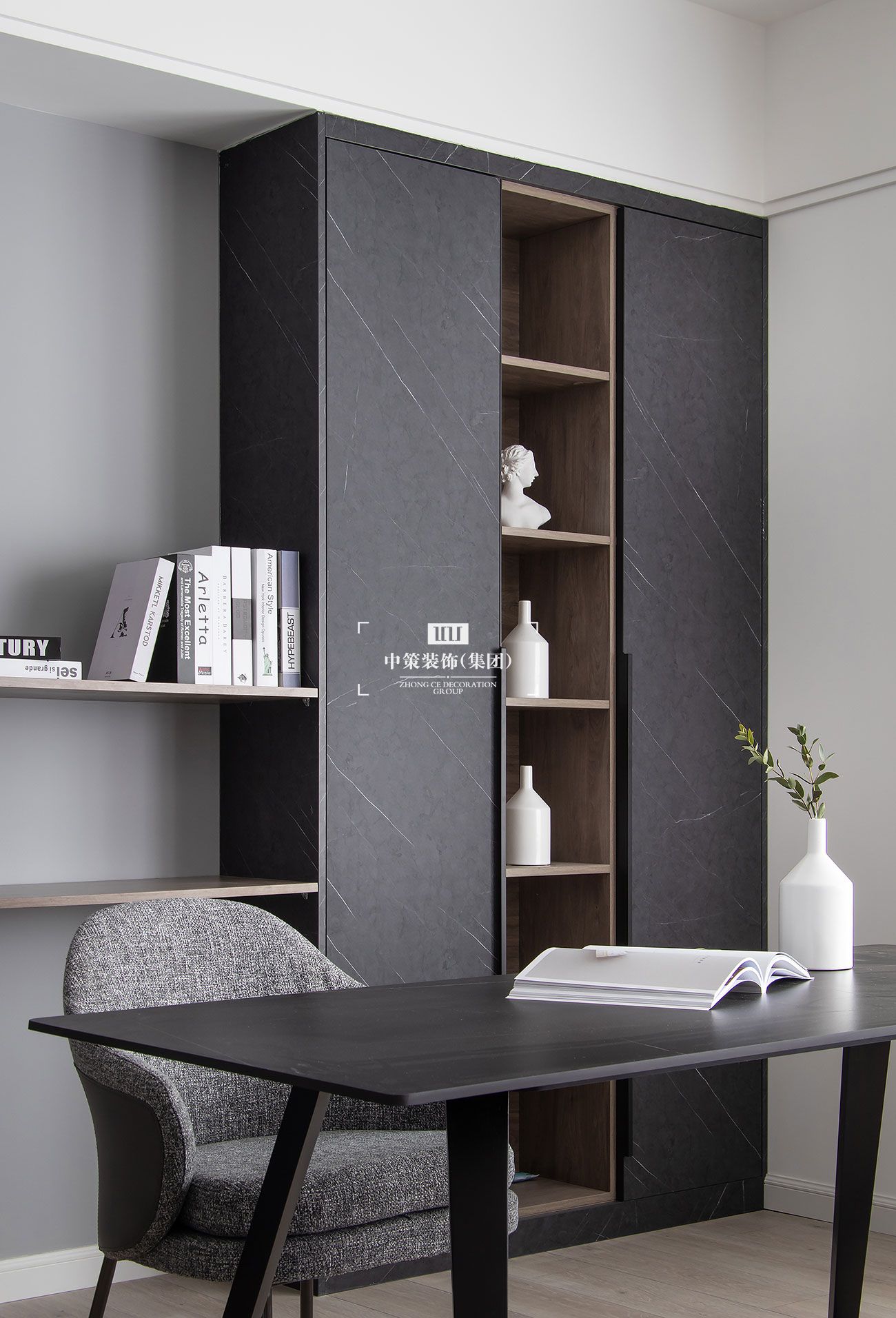 在空间色彩及材质选择上利用地面及顶面的材质过渡进行空间功能的划分,既不影响通透性又能在视觉效果上有明显的区分,黑白灰的搭配让现代简约风格增添经典的元素色彩。