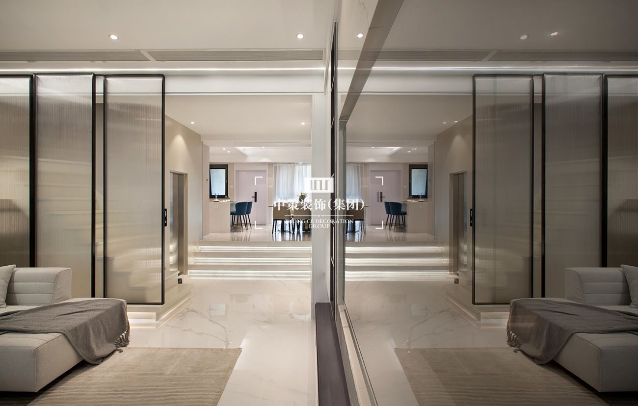 2.客厅:简约的白色柜体与木质背景墙增强了灯光与光线的反射,提高了室内的明亮程度,空间的效果也更强。同时调整布局后,增设了电梯,楼梯也有了更宽阔的空间。